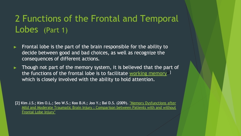[2] Kim J.S.; Kim O.L.; Seo W.S.; Koo B.H.; Joo Y.; Bai D.S. (2009). "Memory Dysfunctions after Mild and Moderate Traumatic Brain Injury : Comparison between Patients with and without Frontal Lobe Injury"