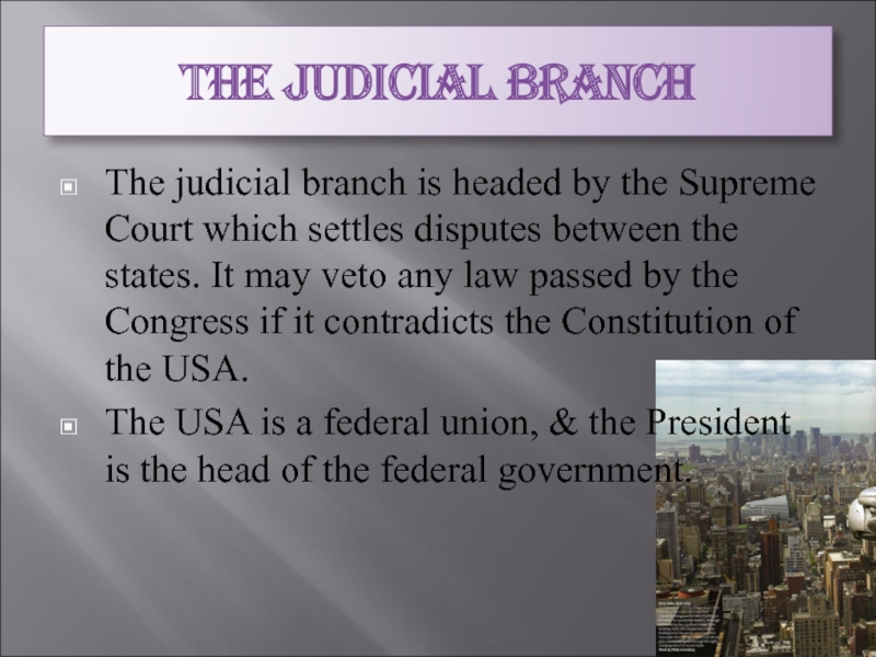 which settles disputes between the states. It may veto any law passed by the Congress if it contradicts the Constitution of the USA.