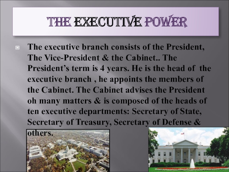 Vice-President & the Cabinet.. The President’s term is 4 years. He is the head of the executive branch , he appoints the members of the Cabinet. The Cabinet advises the President oh many matters & is composed of the heads of ten executive departments: Secretary of State, Secretary of Treasury, Secretary of Defense & others.