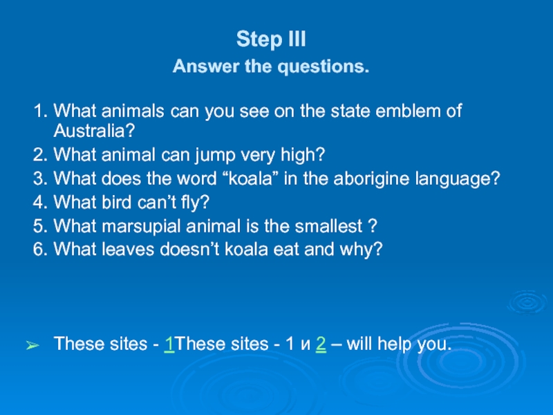 Слайд 4Step II Which of these animals live in Australia? Write their names. Use