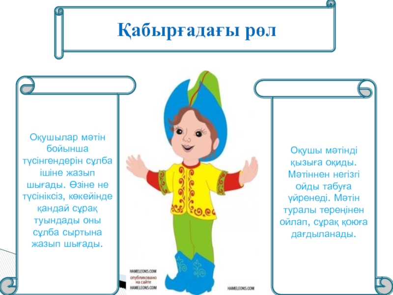 Оқушы мәтінді қызыға оқиды. Мәтіннен негізгі ойды табуға үйренеді. Мәтін туралы тереңінен ойлап, сұрақ қоюға дағдыланады.