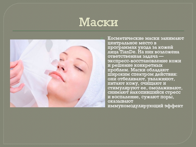 лица TianDe. На них возложена ответственная задача — экспресс-восстановление кожи и решение конкретных проблем. Маски обладают широким спектром действия: они отбеливают, увлажняют, питают кожу, очищают и стимулируют ее, омолаживают, снимают накопившийся стресс и воспаление, сужают поры, оказывают иммуномодулирующий эффект