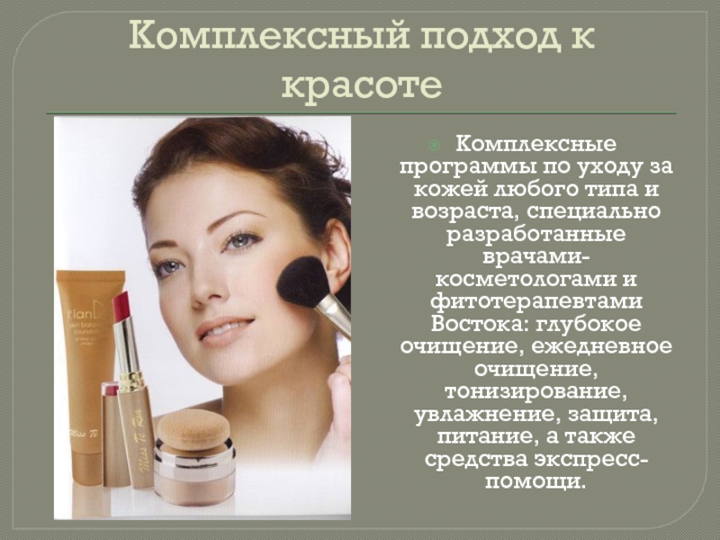 и возраста, специально разработанные врачами-косметологами и фитотерапевтами Востока: глубокое очищение, ежедневное очищение, тонизирование, увлажнение, защита, питание, а также средства экспресс-помощи.