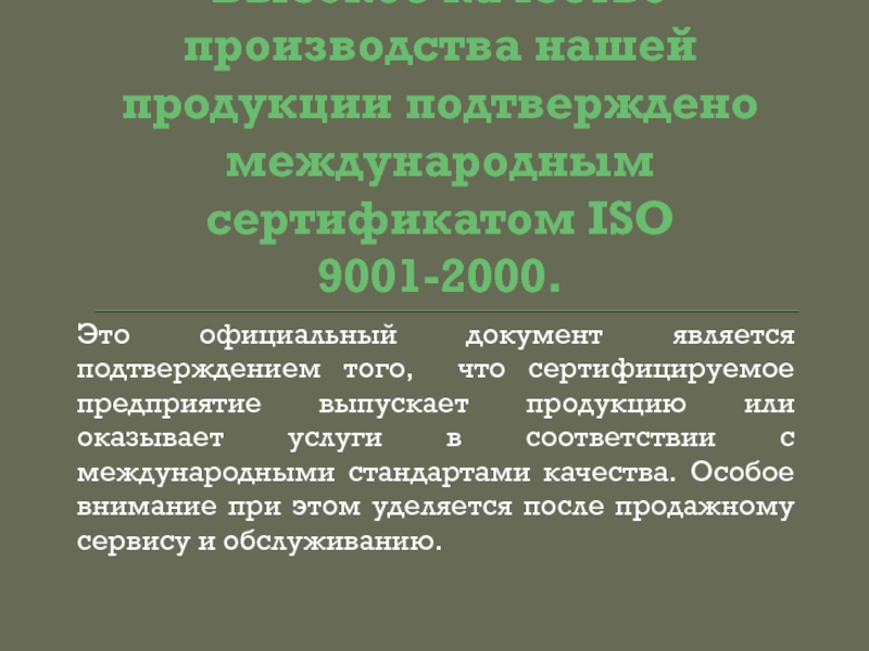 Слайд 7Высокое качество производства нашей продукции подтверждено международным сертификатом ISO 9001-2000.