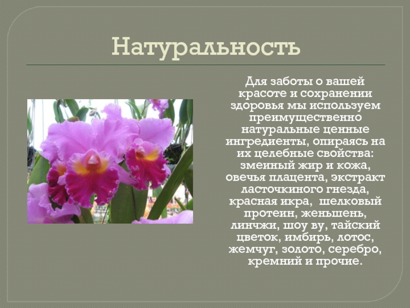используем преимущественно натуральные ценные ингредиенты, опираясь на их целебные свойства: змеиный жир и кожа, овечья плацента, экстракт ласточкиного гнезда, красная икра, шелковый протеин, женьшень, линчжи, шоу ву, тайский цветок, имбирь, лотос, жемчуг, золото, серебро, кремний и прочие.