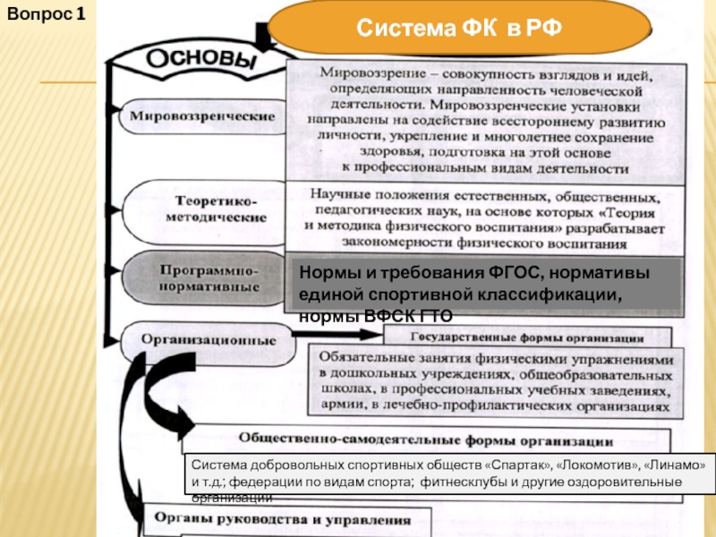 Система добровольных спортивных обществ «Спартак», «Локомотив», «Линамо» и т.д.; федерации по видам спорта; фитнесклубы и другие оздоровительные организации