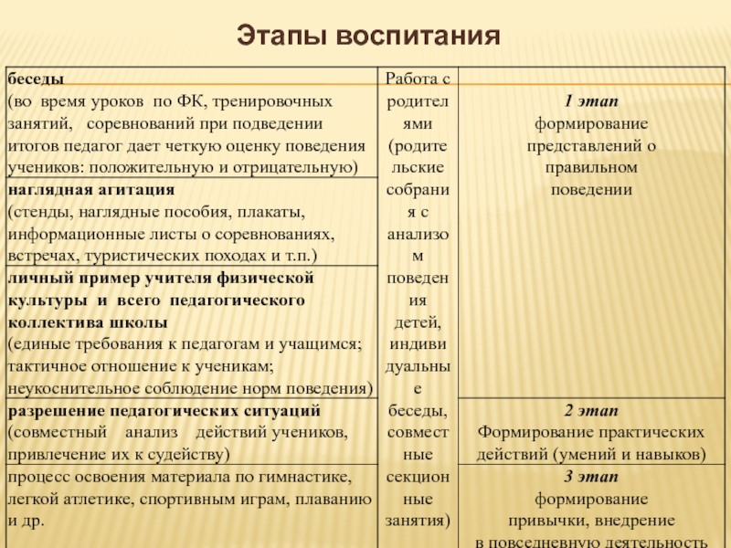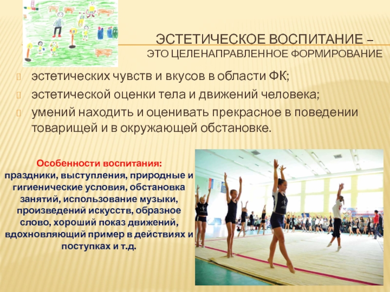 праздники, выступления, природные и гигиенические условия, обстановка занятий, использование музыки, произведений искусств, образное слово, хороший показ движений, вдохновляющий пример в действиях и поступках и т.д.