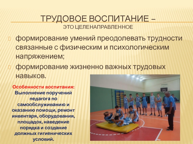 Выполнение поручений педагога по самообслуживанию и оказанию помощи, ремонт инвентаря, оборудования, площадок, наведение порядка и создание должных гигиенических условий.