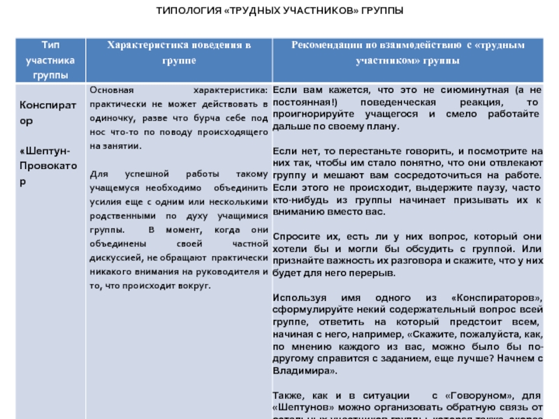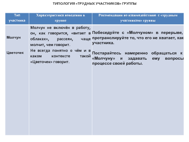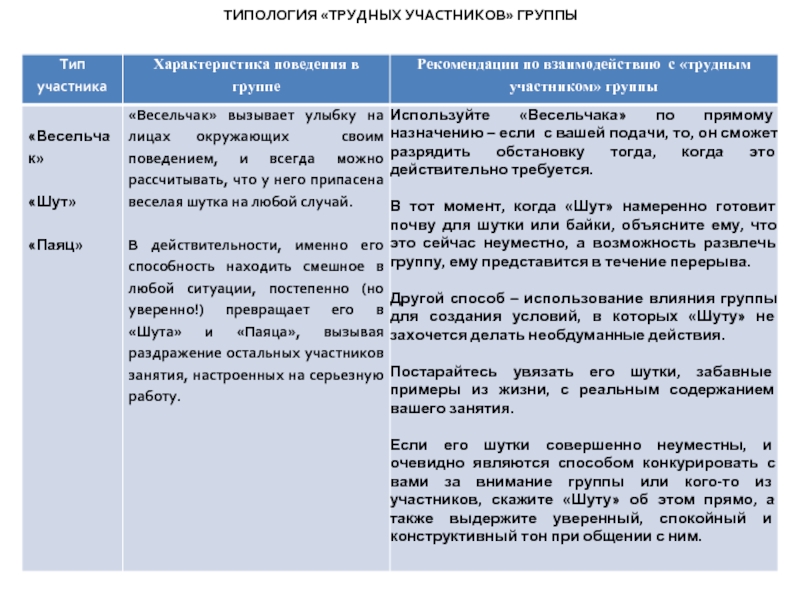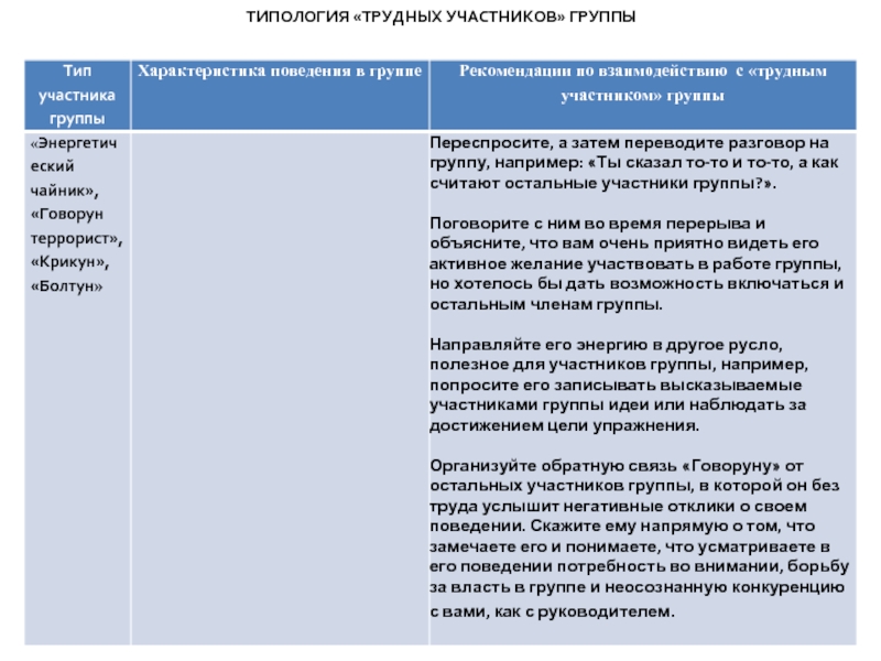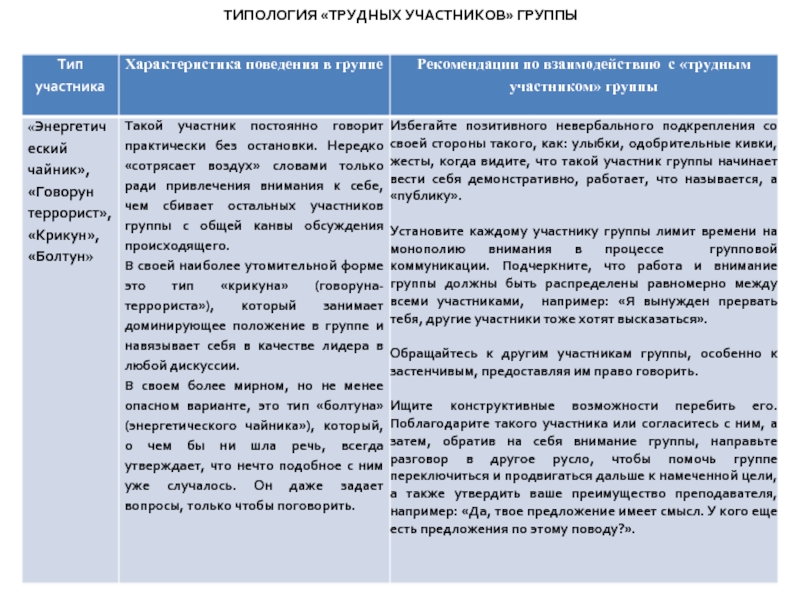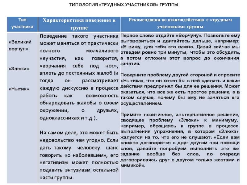 ТИПОЛОГИЯ ТРУДНЫХ УЧАСТНИКОВ ГРУППЫ презентация