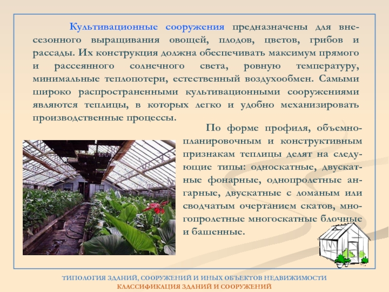 По форме профиля, объемно-планировочным и конструктивным признакам теплицы делят на следу-ющие типы: односкатные, двускат-ные фонарные, однопролетные ан-гарные, двускатные с ломаным или сводчатым очертанием скатов, мно-гопролетные многоскатные блочные и башенные.