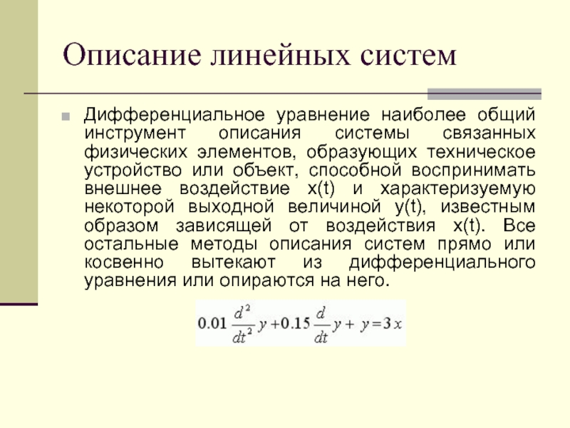 элементов, образующих техническое устройство или объект, способной воспринимать внешнее воздействие x(t) и характеризуемую некоторой выходной величиной y(t), известным образом зависящей от воздействия x(t). Все остальные методы описания систем прямо или косвенно вытекают из дифференциального уравнения или опираются на него.