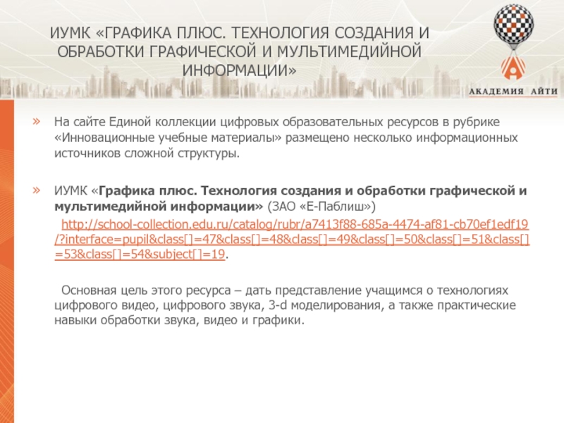 Слайд 28ИУМК «ГРАФИКА ПЛЮС. ТЕХНОЛОГИЯ СОЗДАНИЯ И ОБРАБОТКИ ГРАФИЧЕСКОЙ И МУЛЬТИМЕДИЙНОЙ ИНФОРМАЦИИ»