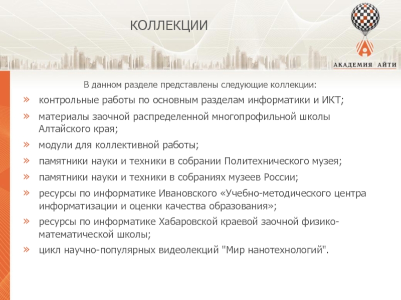 В коллекции представлены видиофрагменты, фотографии, описания устройств для вычислений и электронных цифровых вычислительных машин, биографии основоположников отечественной вычислительной техники.