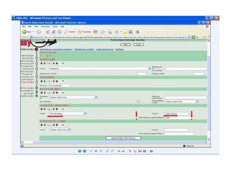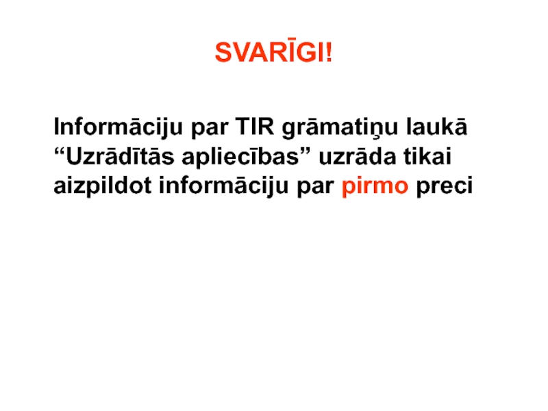 Uzrādītās apliecības veids – TIR grāmatiņa, uzziņa – derīgs TIR numurs (sakrīt ar TIR numuru, kas uzrādīts sadaļā par galvojumiem);