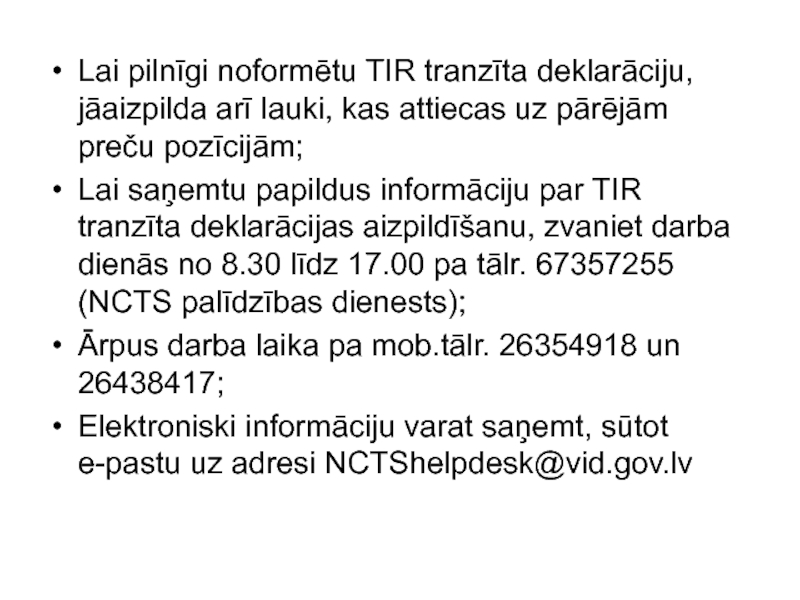 Lai saņemtu papildus informāciju par TIR tranzīta deklarācijas aizpildīšanu, zvaniet darba dienās no 8.30 līdz 17.00 pa tālr. 67357255 (NCTS palīdzības dienests);