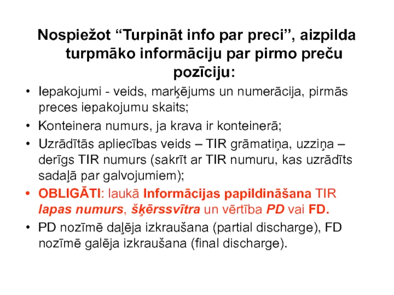 OBLIGĀTI: laukā Informācijas papildināšana TIR lapas numurs, šķērssvītra un vērtība PD vai FD.
