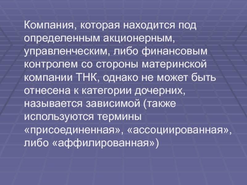 контролем со стороны материнской компании ТНК, однако не может быть отнесена к категории дочерних, называется зависимой (также используются термины «присоединенная», «ассоциированная», либо «аффилированная»)
