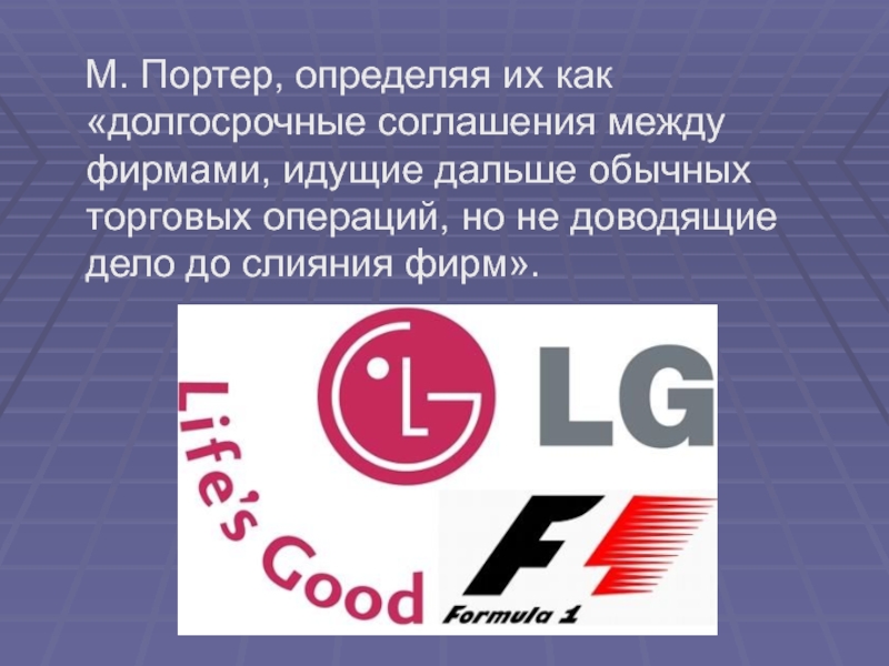 Слайд 37 М. Портер, определяя их как «долгосрочные соглашения между фирмами,
