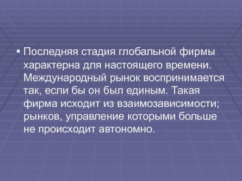 Слайд 27Последняя стадия глобальной фирмы характерна для настоящего времени. Международный рынок воспринимается