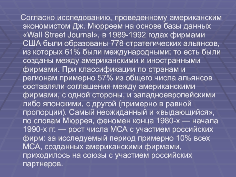 базы данных «Wall Street Journal», в 1989-1992 годах фирмами США были образованы 778 стратегических альянсов, из которых 61% были международными; то есть были созданы между американскими и иностранными фирмами. При классификации по странам и регионам примерно 57% из общего числа альянсов составляли соглашения между американскими фирмами, с одной стороны, и западноевропейскими либо японскими, с другой (примерно в равной пропорции). Самый неожиданный и «выдающийся», по словам Мюррея, феномен конца 1980-х — начала 1990-х гг. — рост числа МСА с участием российских фирм: за исследуемый период примерно 10% всех МСА, созданных американскими фирмами, приходилось на союзы с участием российских партнеров.