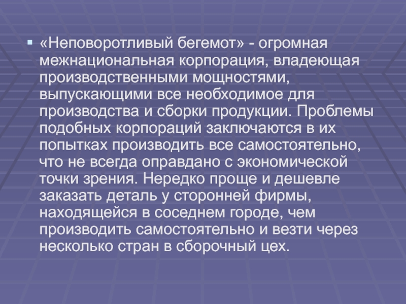 Слайд 40«Неповоротливый бегемот» - огромная межнациональная корпорация, владеющая производственными мощностями, выпускающими все