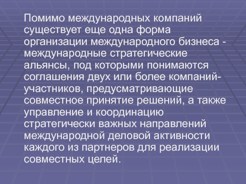 бизнеса - международные стратегические альянсы, под которыми понимаются соглашения двух или более компаний-участников, предусматривающие совместное принятие решений, а также управление и координацию стратегически важных направлений международной деловой активности каждого из партнеров для реализации совместных целей.