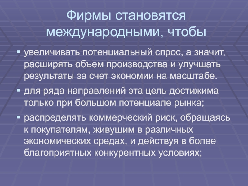 распределять коммерческий риск, обращаясь к покупателям, живущим в различных экономических средах, и действуя в более благоприятных конкурентных условиях;