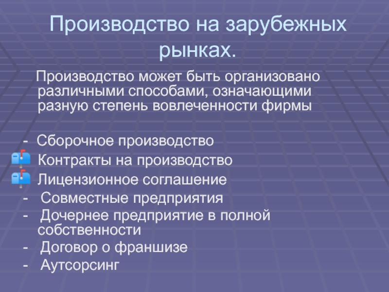 рубежом для того, чтобы уменьшить затраты. Производство обычно размещается в стране с невысокой стоимостью рабочей силы, а конечный продукт продается на внутреннем рынке страны, в которой зарегистрирована корпорация. Это довольно распространенная стратегия в области, например, электроники и текстиля.