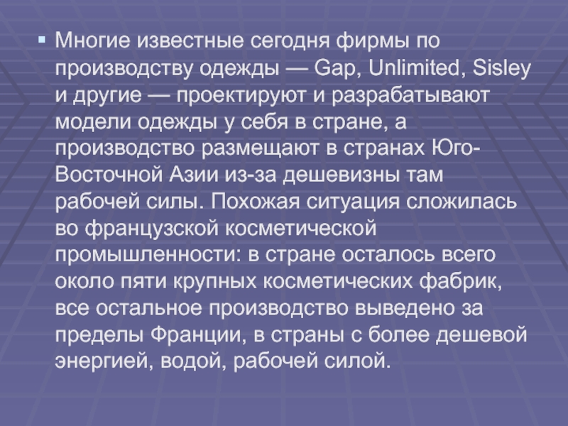 и другие — проектируют и разрабатывают модели одежды у себя в стране, а производство размещают в странах Юго-Восточной Азии из-за дешевизны там рабочей силы. Похожая ситуация сложилась во французской косметической промышленности: в стране осталось всего около пяти крупных косметических фабрик, все остальное производство выведено за пределы Франции, в страны с более дешевой энергией, водой, рабочей силой.