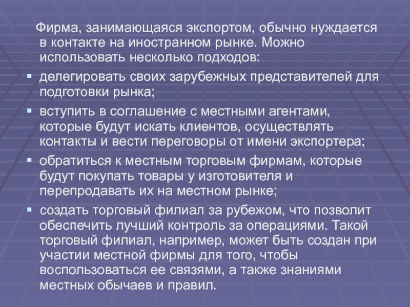 вступить в соглашение с местными агентами, которые будут искать клиентов, осуществлять контакты и вести переговоры от имени экспортера;
