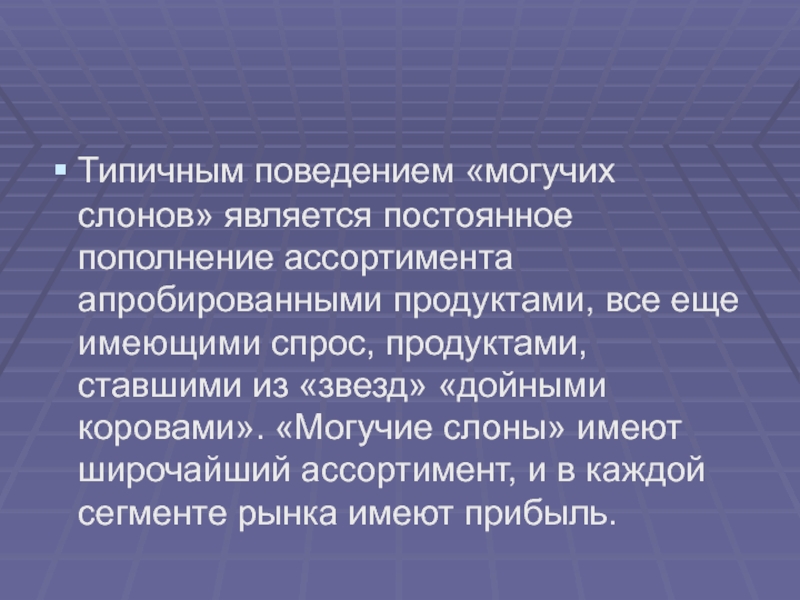 Слайд 39Типичным поведением «могучих слонов» является постоянное пополнение ассортимента апробированными продуктами, все