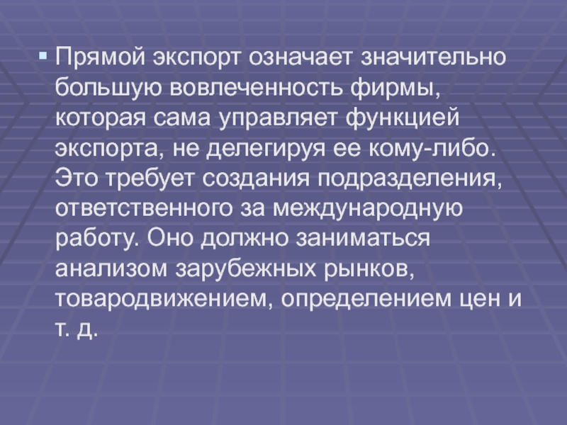 Слайд 10Прямой экспорт означает значительно большую вовлеченность фирмы, которая сама управляет функцией