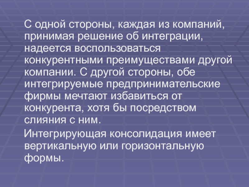 интеграции, надеется воспользоваться конкурентными преимуществами другой компании. С другой стороны, обе интегрируемые предпринимательские фирмы мечтают избавиться от конкурента, хотя бы посредством слияния с ним.