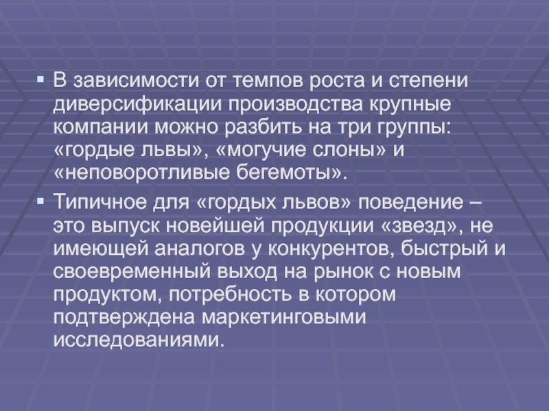 Слайд 38В зависимости от темпов роста и степени диверсификации производства крупные компании