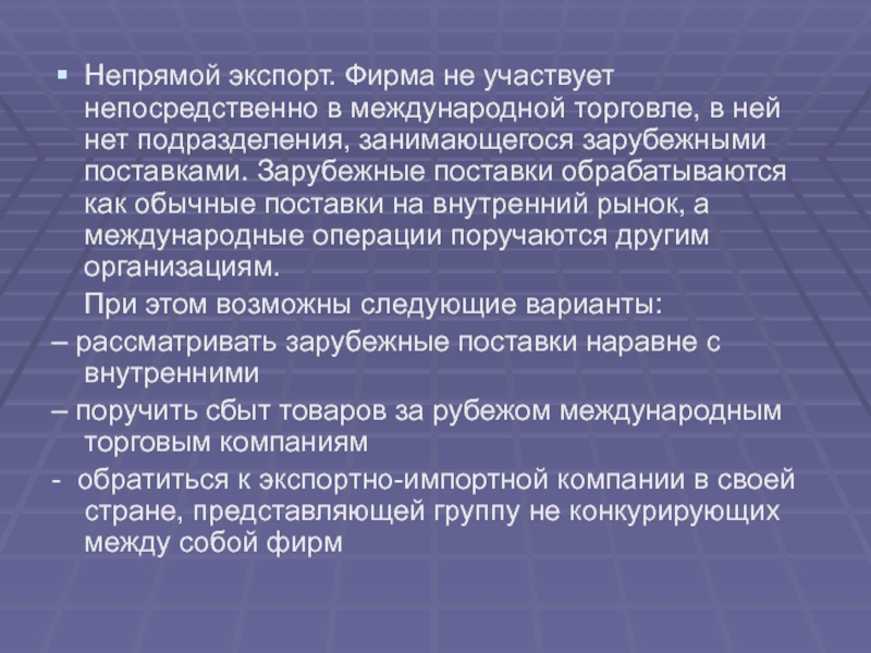 Слайд 9Непрямой экспорт. Фирма не участвует непосредственно в международной торговле, в ней
