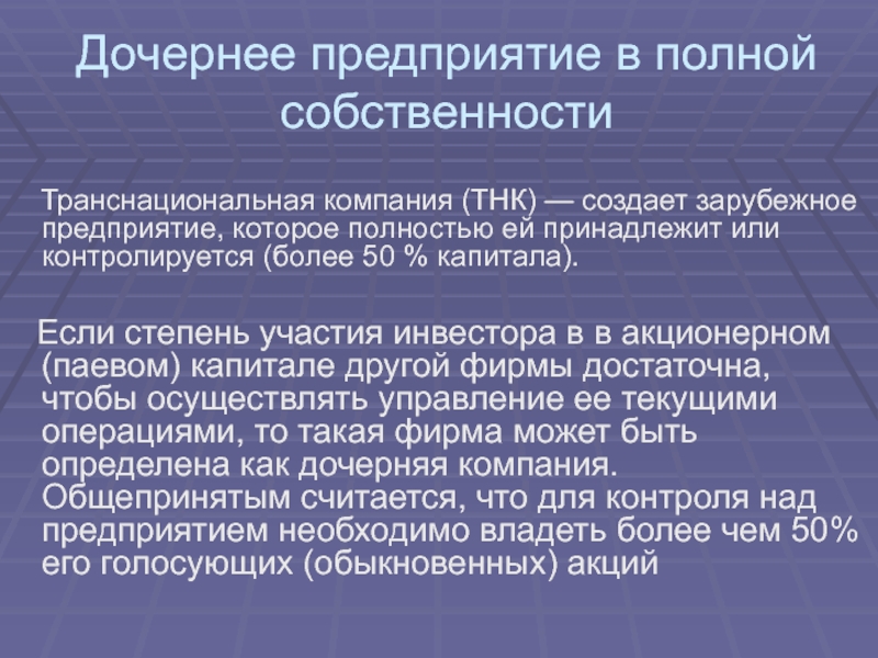 (ТНК) — создает зарубежное предприятие, которое полностью ей принадлежит или контролируется (более 50 % капитала).