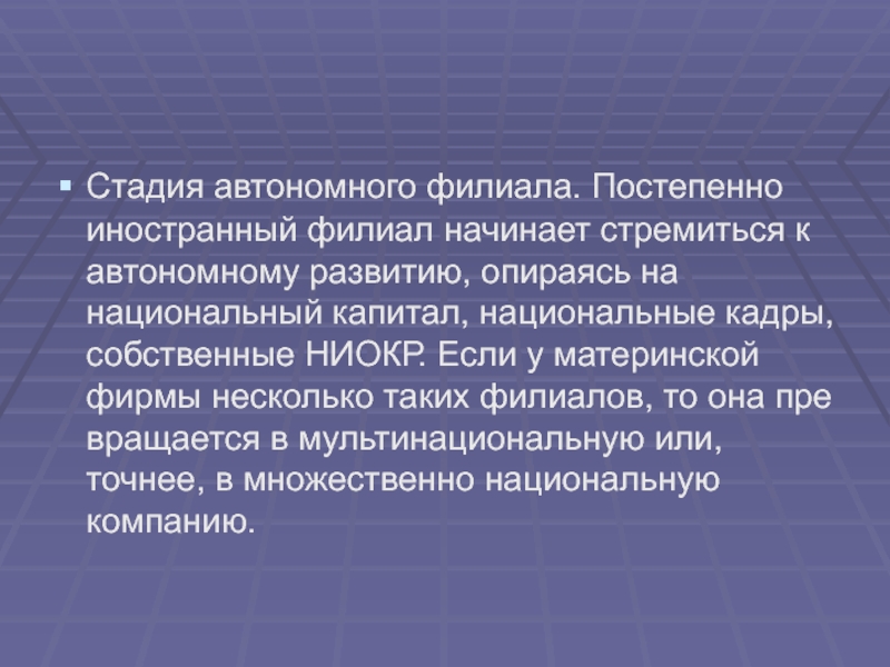 Слайд 26Стадия автономного филиала. Постепенно иностранный филиал начинает стремиться к автономному развитию,
