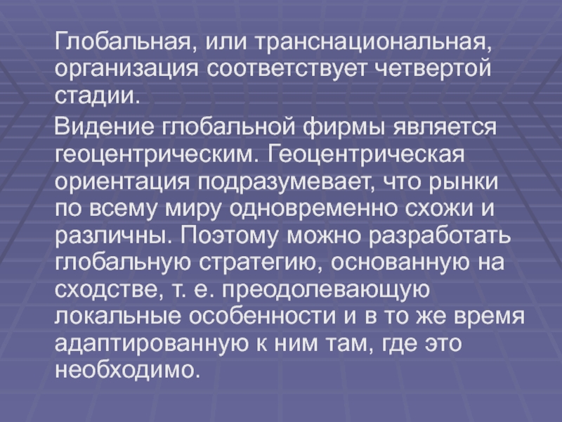 Видение глобальной фирмы является геоцентрическим. Геоцентрическая ориентация подразумевает, что рынки по всему миру одновременно схожи и различны. Поэтому можно разработать глобальную стратегию, основанную на сходстве, т. е. преодолевающую локальные особенности и в то же время адаптированную к ним там, где это необходимо.