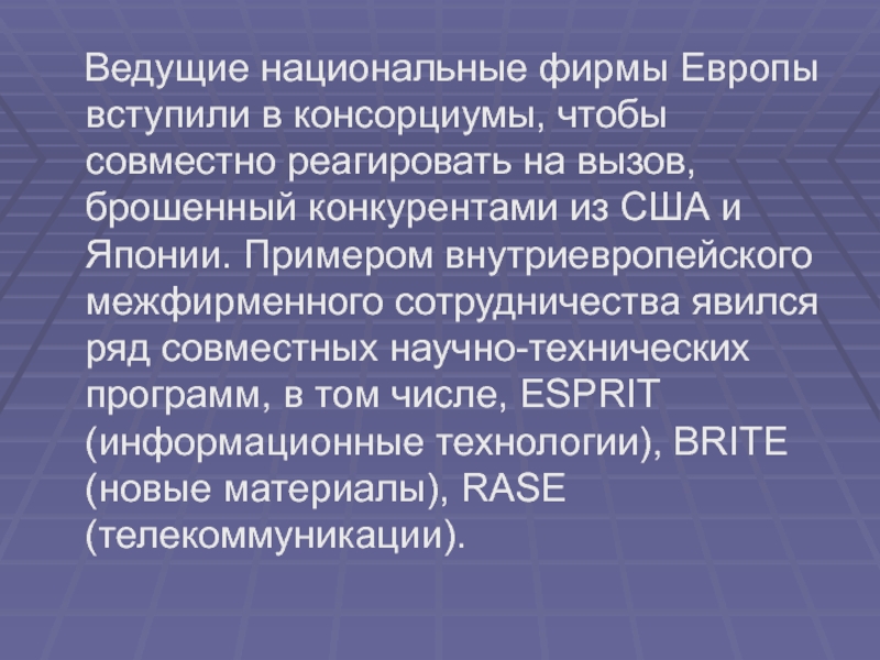 реагировать на вызов, брошенный конкурентами из США и Японии. Примером внутриевропейского межфирменного сотрудничества явился ряд совместных научно-технических программ, в том числе, ESPRIT (информационные технологии), BRITE (новые материалы), RASE (телекоммуникации).