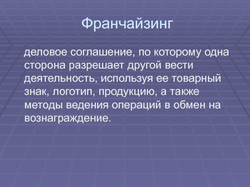 вести деятельность, используя ее товарный знак, логотип, продукцию, а также методы ведения операций в обмен на вознаграждение.