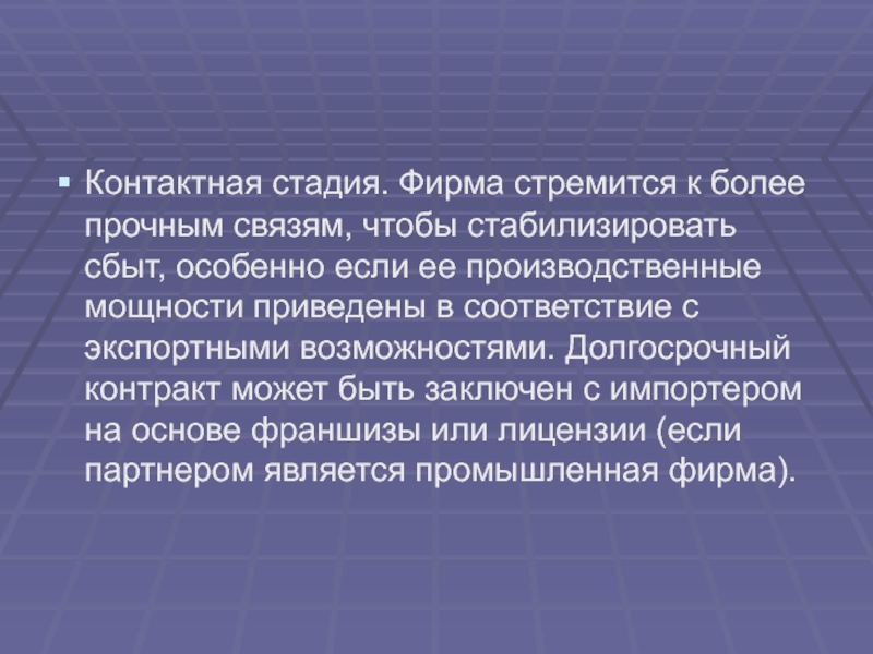 особенно если ее производственные мощности приведены в соответствие с экспортными возможностями. Долгосрочный контракт может быть заключен с импортером на основе франшизы или лицензии (если партнером является промышленная фирма).