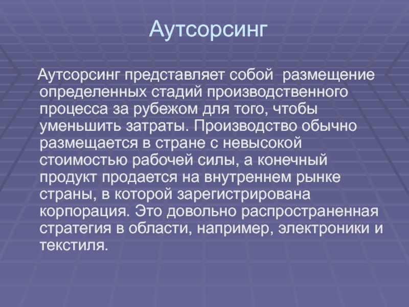 Аутсорсинг представляет собой размещение определенных стадий производственного процесса за