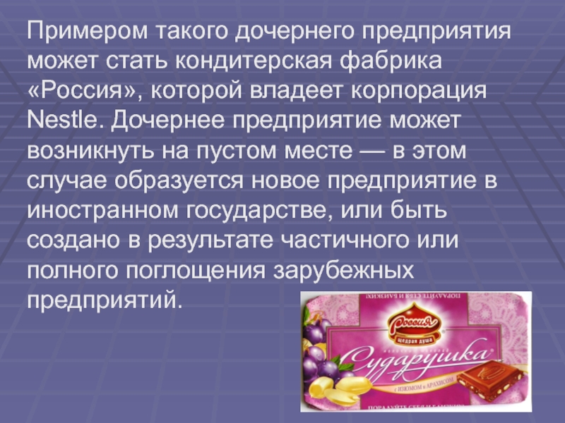 Слайд 14 Примером такого дочернего предприятия может стать кондитерская фабрика «Россия»,