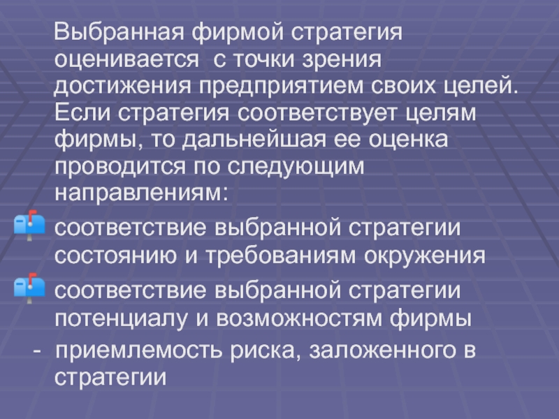 Слайд 21 Выбранная фирмой стратегия оценивается с точки зрения достижения предприятием