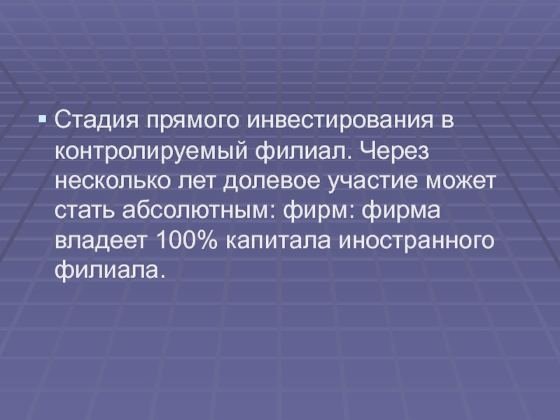 Слайд 25Стадия прямого инвестирования в контролируемый филиал. Через несколько лет долевое участие