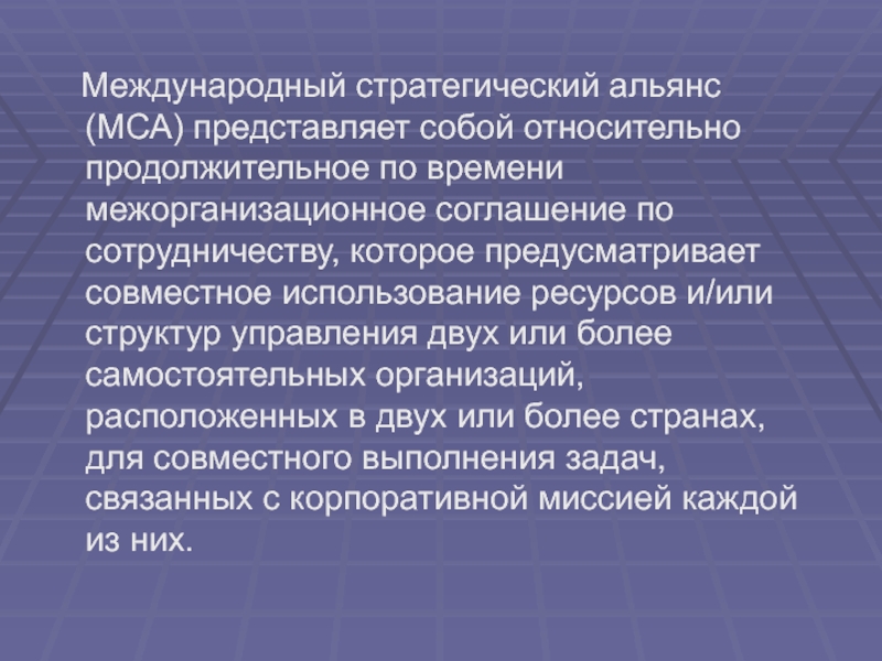 Слайд 33 Международный стратегический альянс (МСА) представляет собой относительно продолжительное по