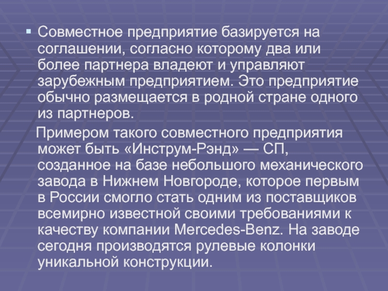 Примером такого совместного предприятия может быть «Инструм-Рэнд» — СП, созданное на базе небольшого механического завода в Нижнем Новгороде, которое первым в России смогло стать одним из поставщиков всемирно известной своими требованиями к качеству компании Mercedes-Benz. На заводе сегодня производятся рулевые колонки уникальной конструкции.
