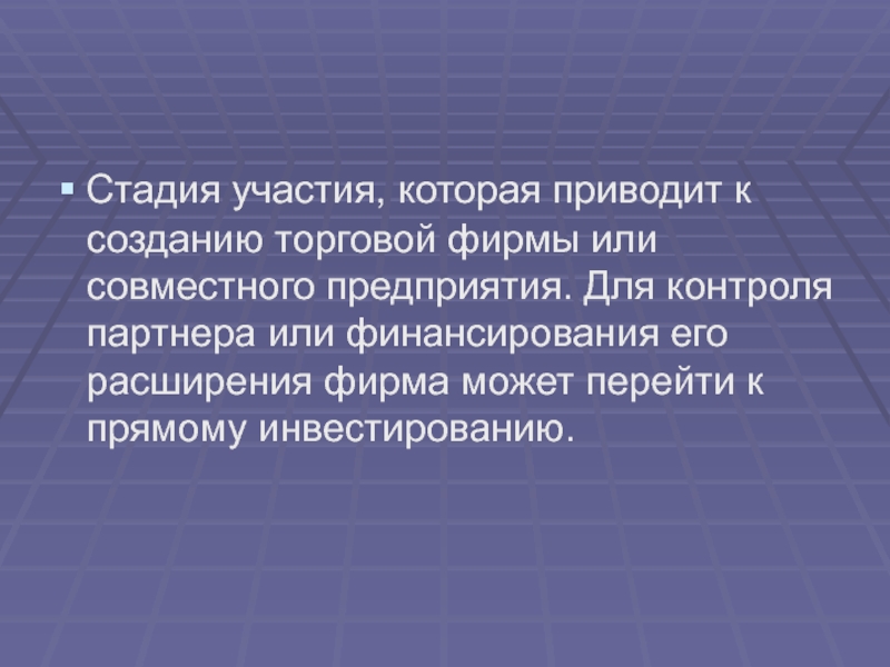Слайд 24Стадия участия, которая приводит к созданию торговой фирмы или совместного предприятия.