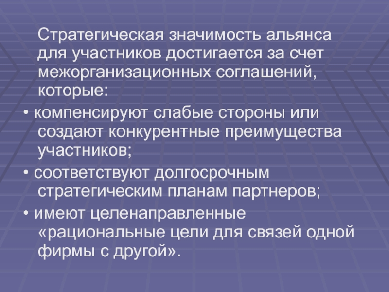Слайд 36 Стратегическая значимость альянса для участников достигается за счет межорганизационных