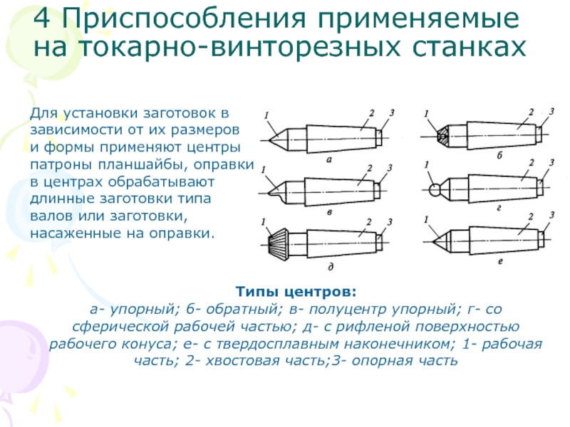 а- упорный; б- обратный; в- полуцентр упорный; г- со сферической рабочей частью; д- с рифленой поверхностью рабочего конуса; е- с твердосплавным наконечником; 1- рабочая часть; 2- хвостовая часть;3- опорная часть